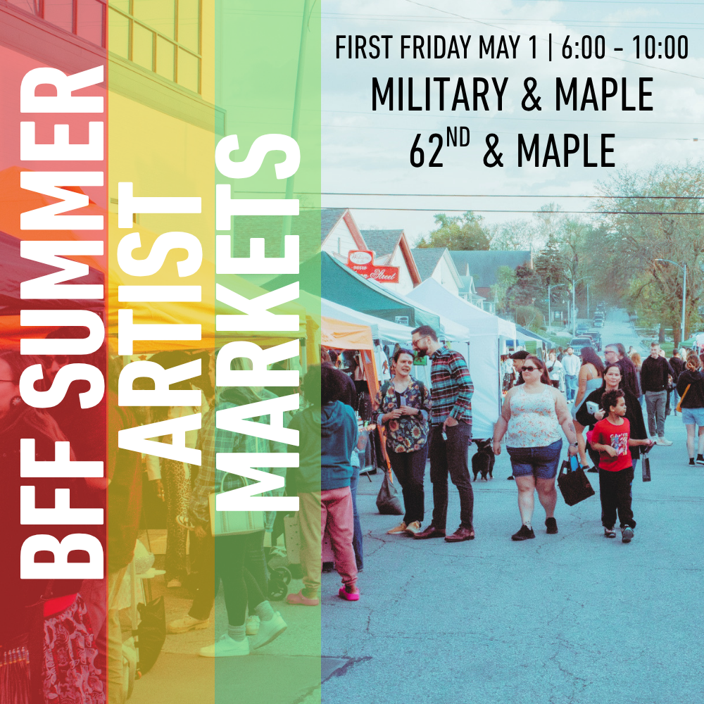 The mission of BFF Omaha is to build community through arts engagement in the Benson Creative District and beyond! Become a Friend of BFF today and get exclusive PERKS every First Friday! Support BFF Omaha and become a Friend at the Artist Market or the BFF Happy Hour!