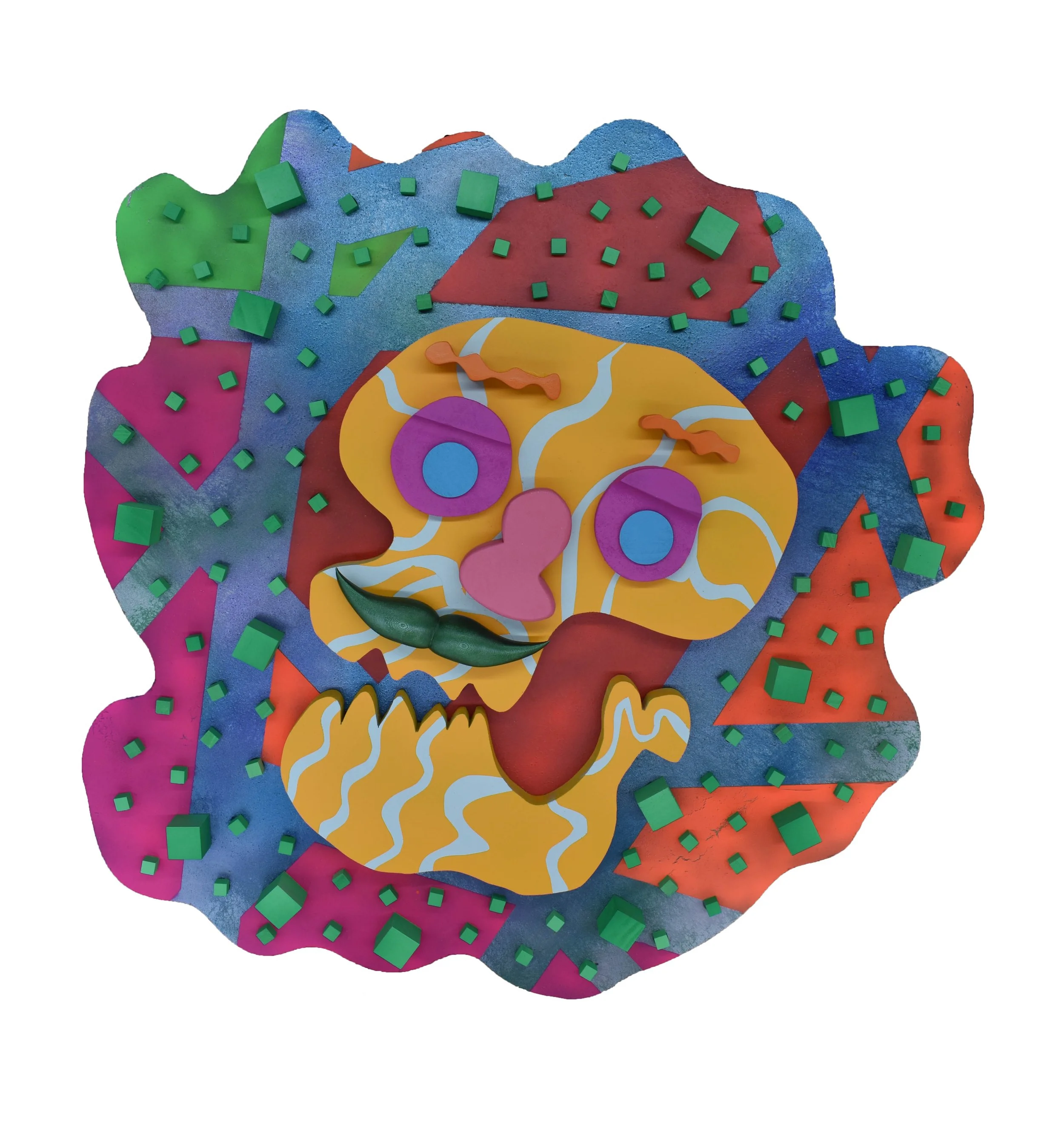 Working primarily with wood and spray paint, Guzman balances organic texture with fast-paced, energetic color. The tactile quality of wood grounds the work, while spray paint introduces movement and vibrancy. Rather than rigidly planning each piece, he often responds intuitively to the materials and the evolving composition, allowing the work to develop organically.