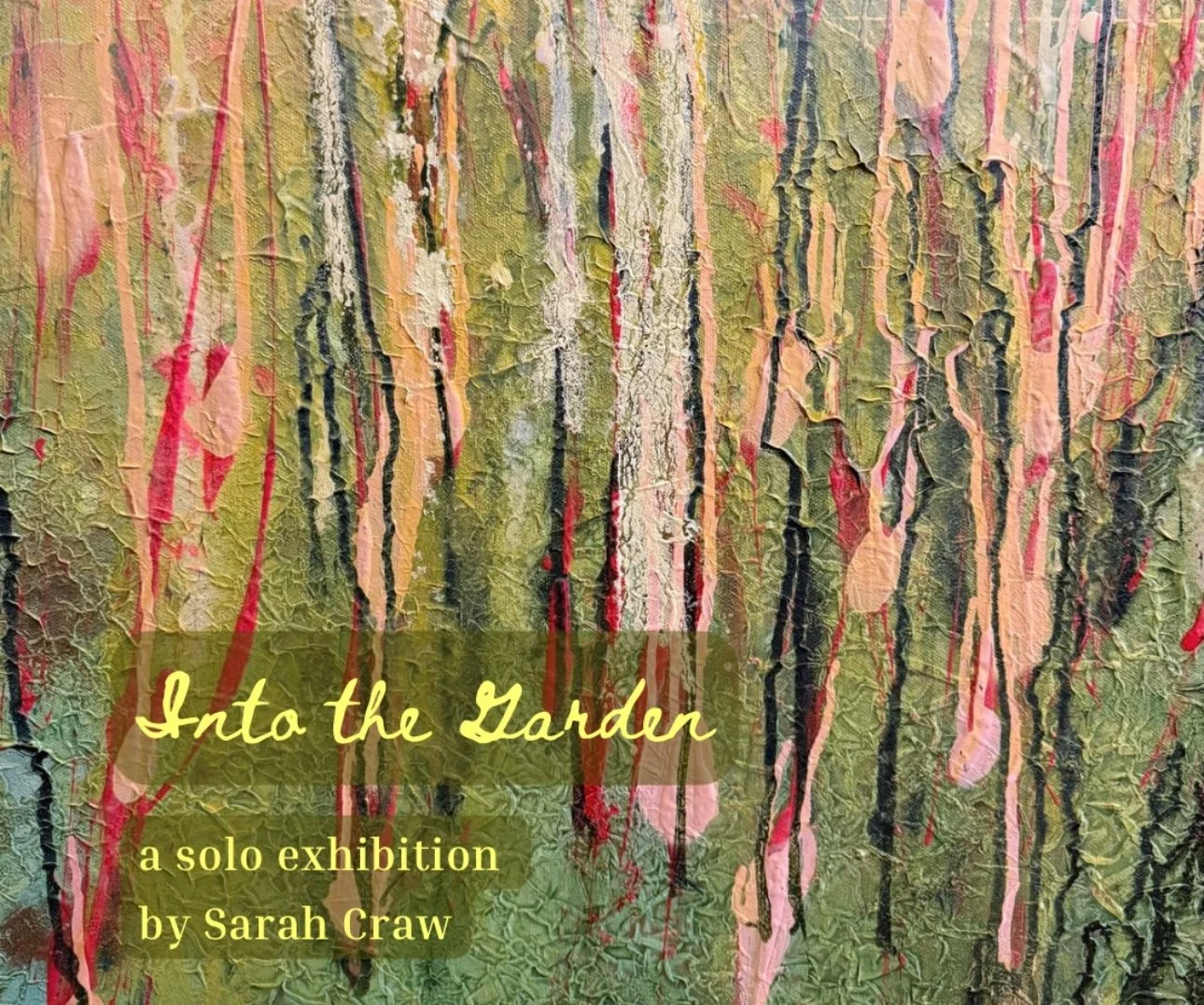 Into the Garden features contemporary mixed media abstract paintings on canvas. Sarah Craw blends heavy-bodied texture with fluid acrylics through layered pouring, scraping, and intentional mark-making. Repetitive patterns and formative shapes offer viewers insight into her process, while selective material combinations create compositions that reflect a state of play. Earth-toned colors, textured surfaces, and botanical motifs shape narrative works inspired by the natural world.